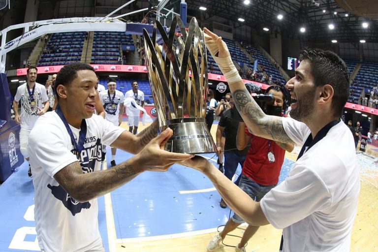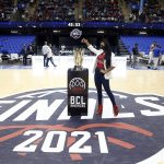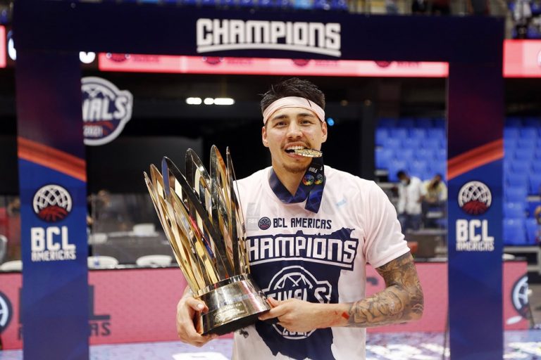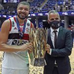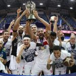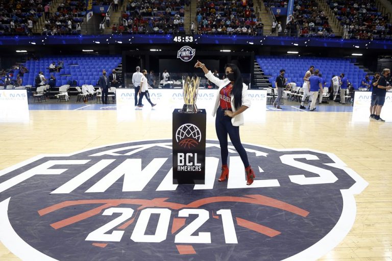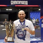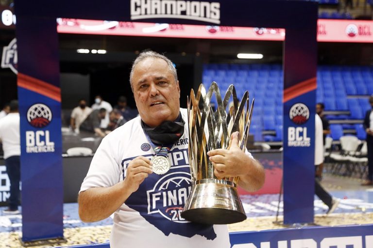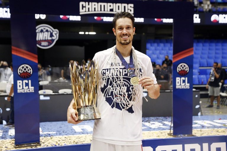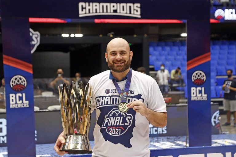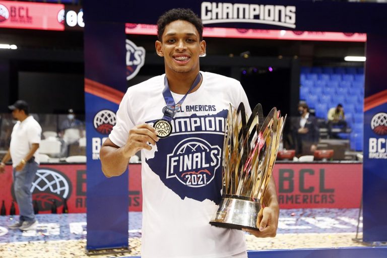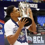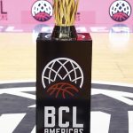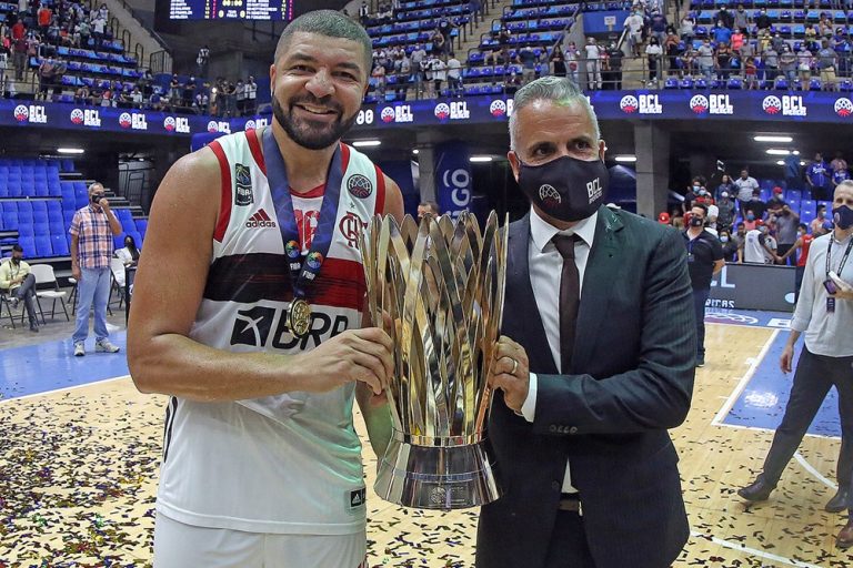 Observado por Yago, Olivinha com o troféu de campeão da BCLA de 2021. Foto: Gaspar Nóbrega/FIBA (Os cliques da final da BCLA 2021 e da comemoração do Flamengo pelas lentes do brasileiro Gaspar Nóbrega (FIBA)) -