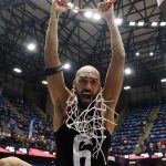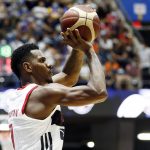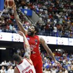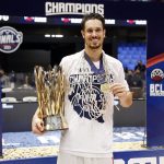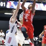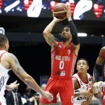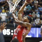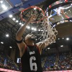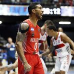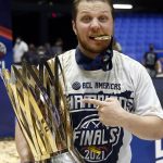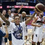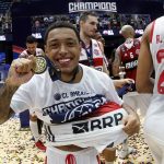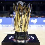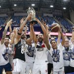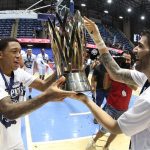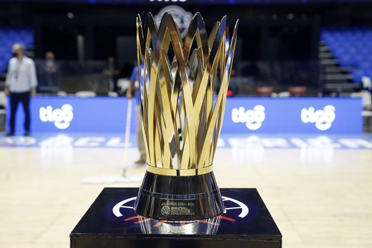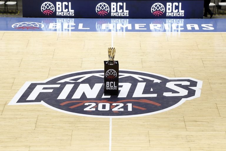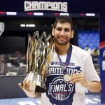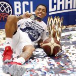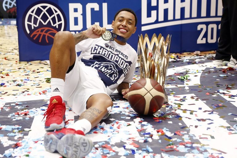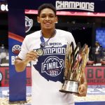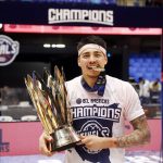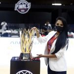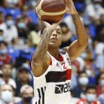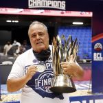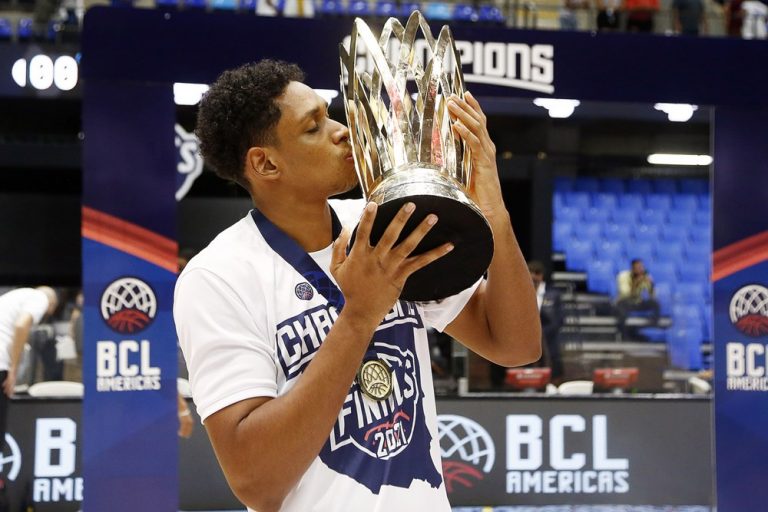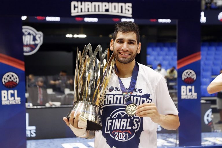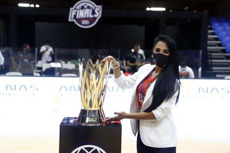 Observado por Yago, Olivinha com o troféu de campeão da BCLA de 2021. Foto: Gaspar Nóbrega/FIBA (Os cliques da final da BCLA 2021 e da comemoração do Flamengo pelas lentes do brasileiro Gaspar Nóbrega (FIBA)) -