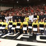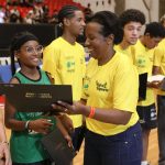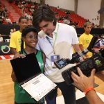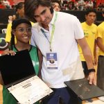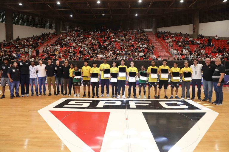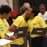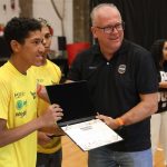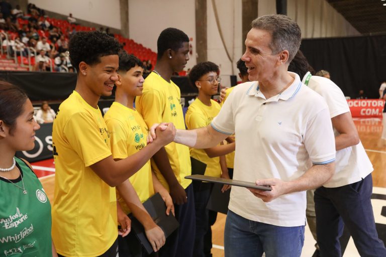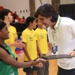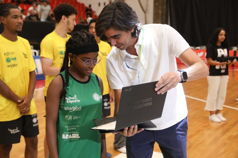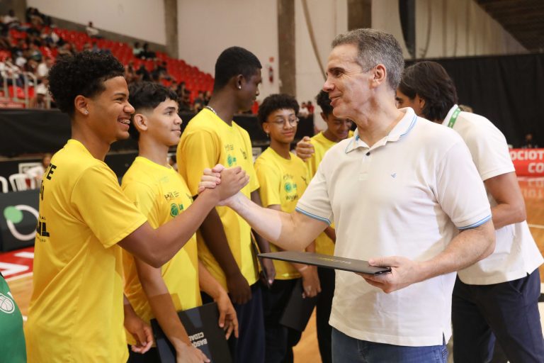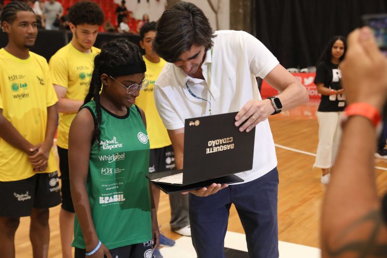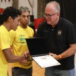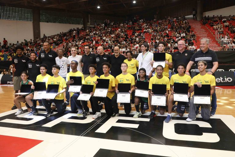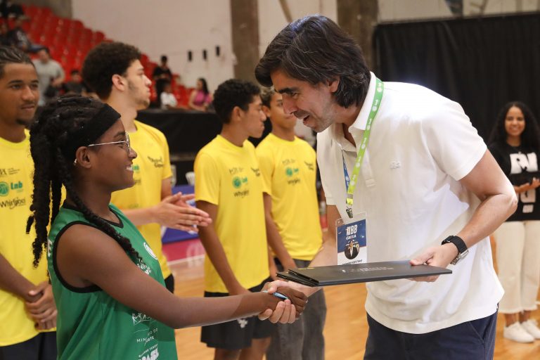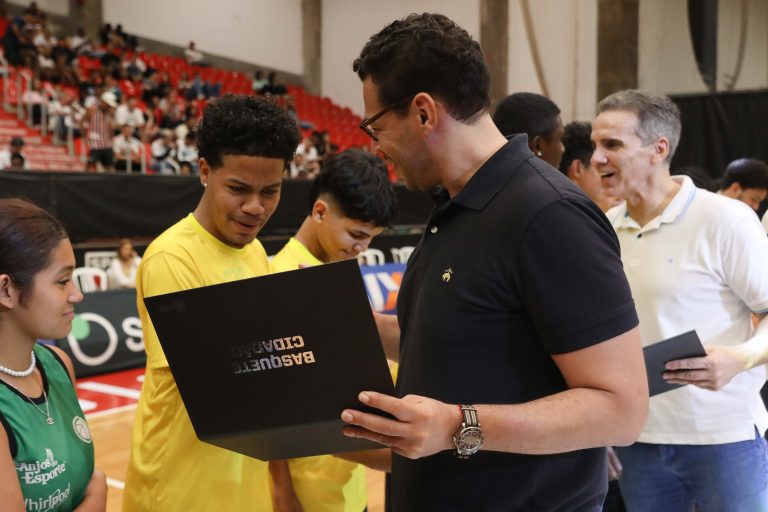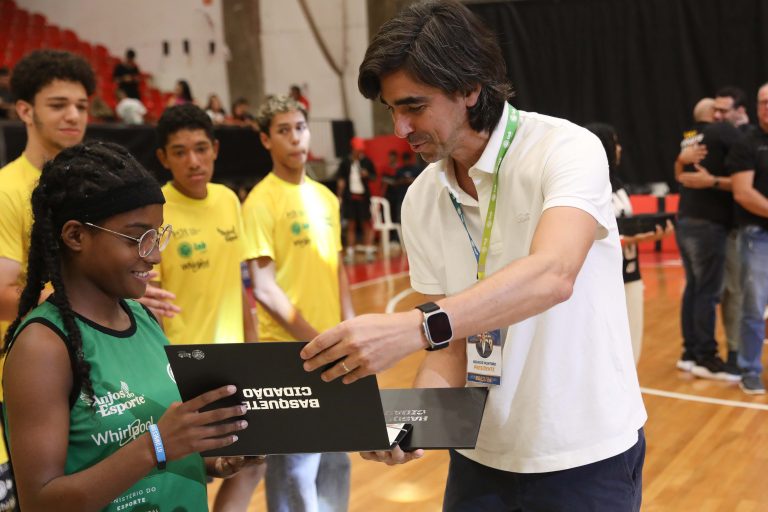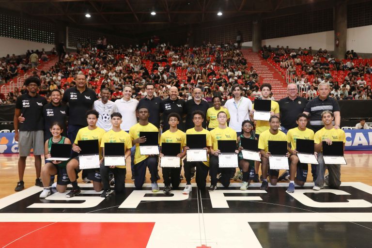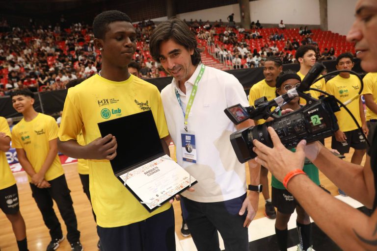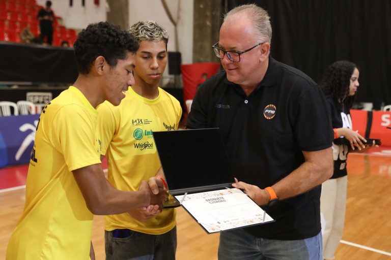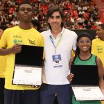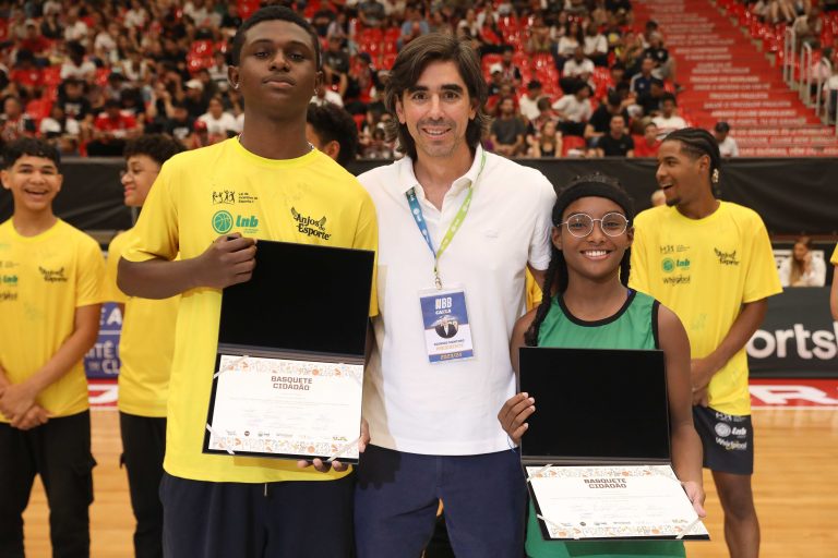 Presidente da LNB, Rodrigo Montouro, entregando o certificado do curso para Renan e Jamilly, os melhores da primeira turma do Basquete Cidadão no curso de arbitragem. Foto: João Neto/LNB/ Fotojump(Foto: João Neto/ LNB/ Fotojump) -