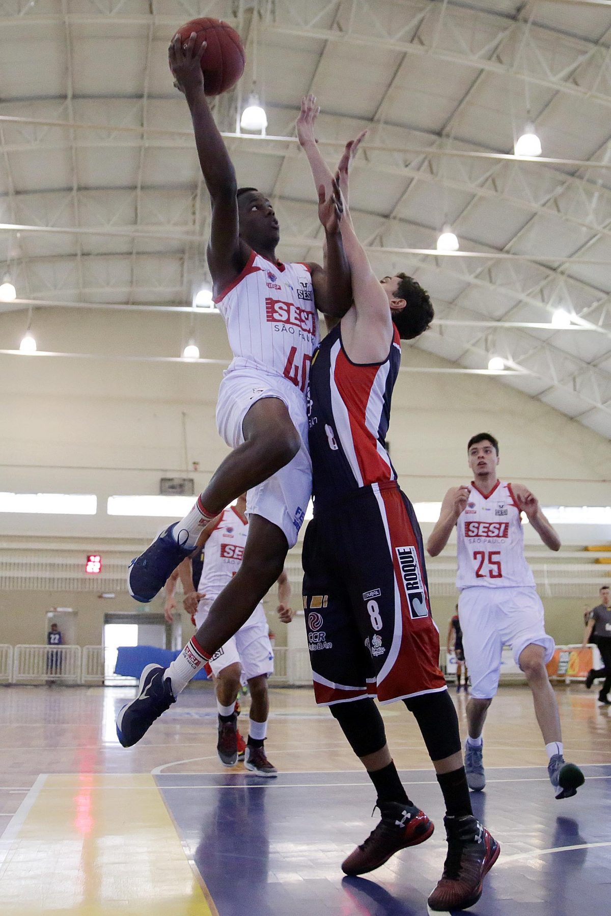 João Pedro acerta arremesso de dois pontos. (1/4 - 25.0% - Equipe: 2/5 - 40.0%)