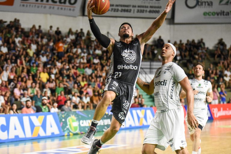 Cauê pega rebote ofensivo.