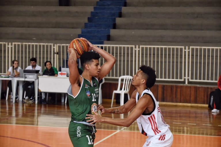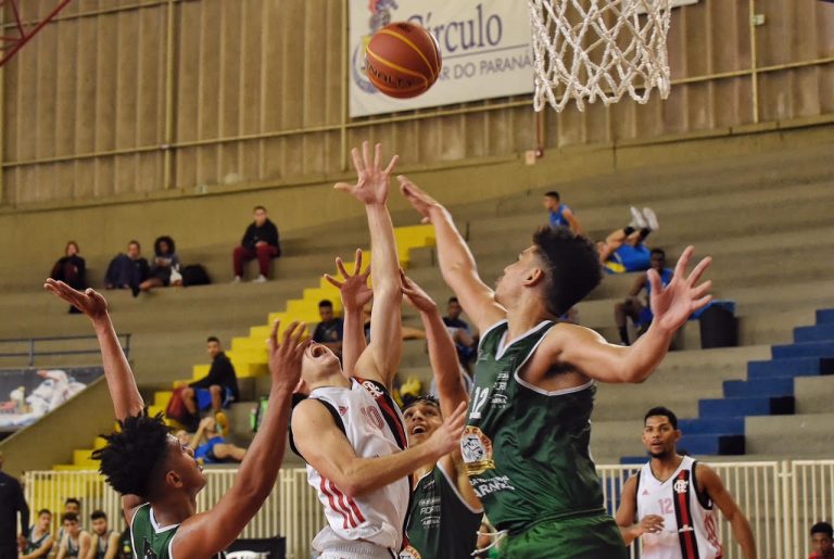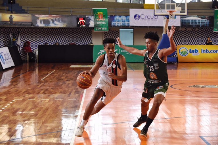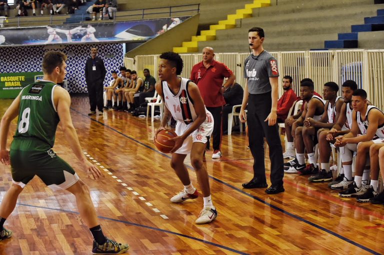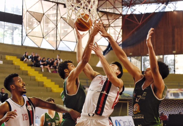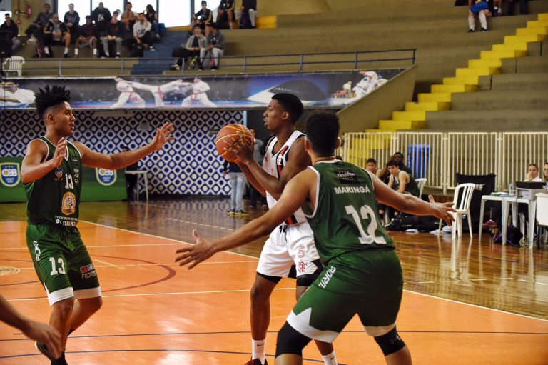 Início parelho: O primeiro tempo foi muito acirrado com um atleta em especial chamando atenção. O armador João Matheus, do Flamengo, foi o autor de 17 pontos, mas quem se sobressaiu no primeiro tempo foi o Maringá, por 37 a 39, com uma virada no final do segundo quarto após dois pontos convertidos pelo ala Mãozinha.