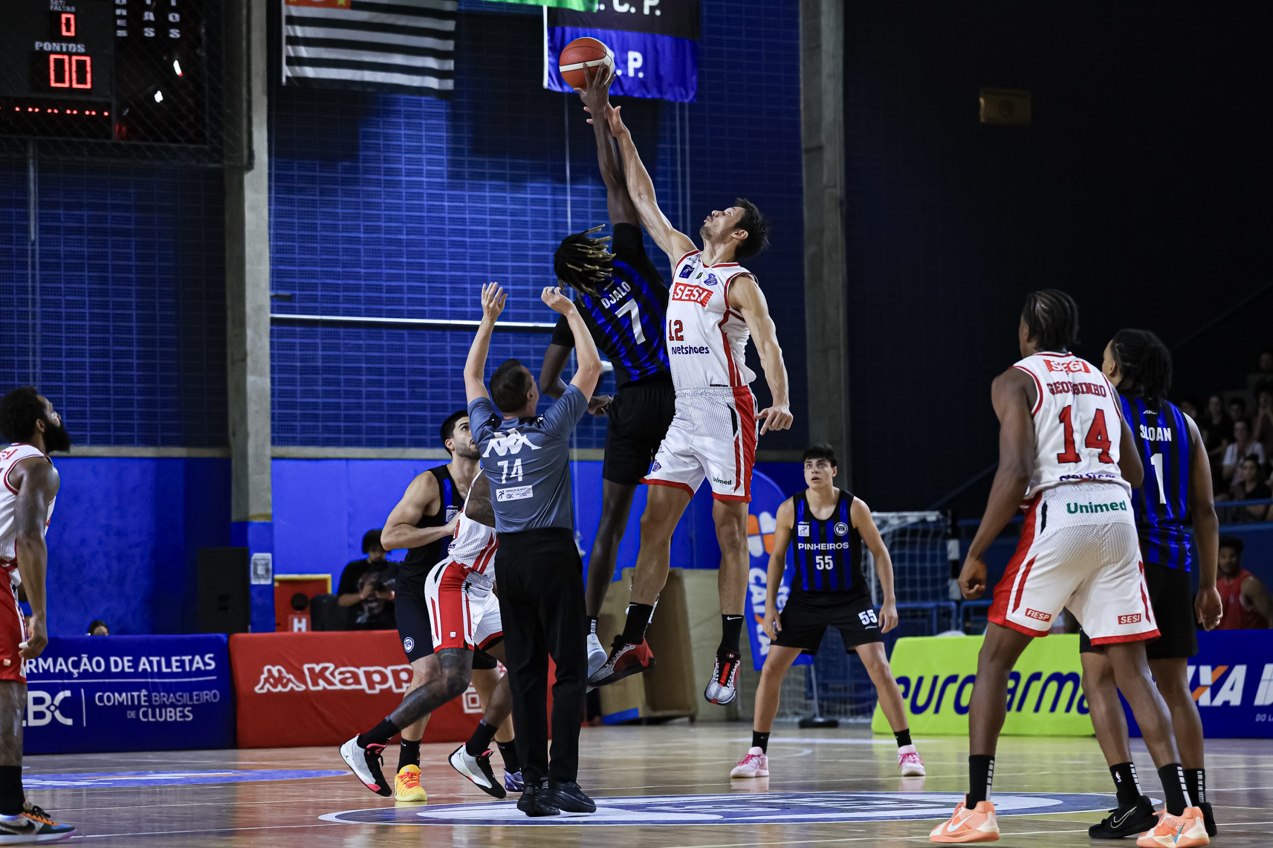 O duelo começou travado, com intensidade máxima dos dois lados e clara prioridade defensiva. As equipes pressionaram a bola, fecharam linhas de passe e protegeram o garrafão, forçando ataques longos e decisões no limite do relógio. Pinheiros e Sesi Franca produziram volume parecido, mas o time francano foi um pouquinho mais preciso na execução, especialmente ao obter pequenas vantagens criadas no jogo de meia quadra com Georginho. Essa diferença se traduziu em margem mínima no primeiro período: 17 a 16.