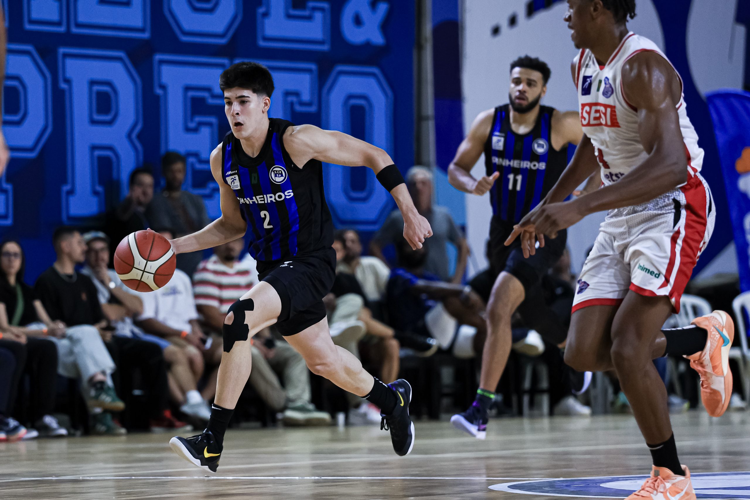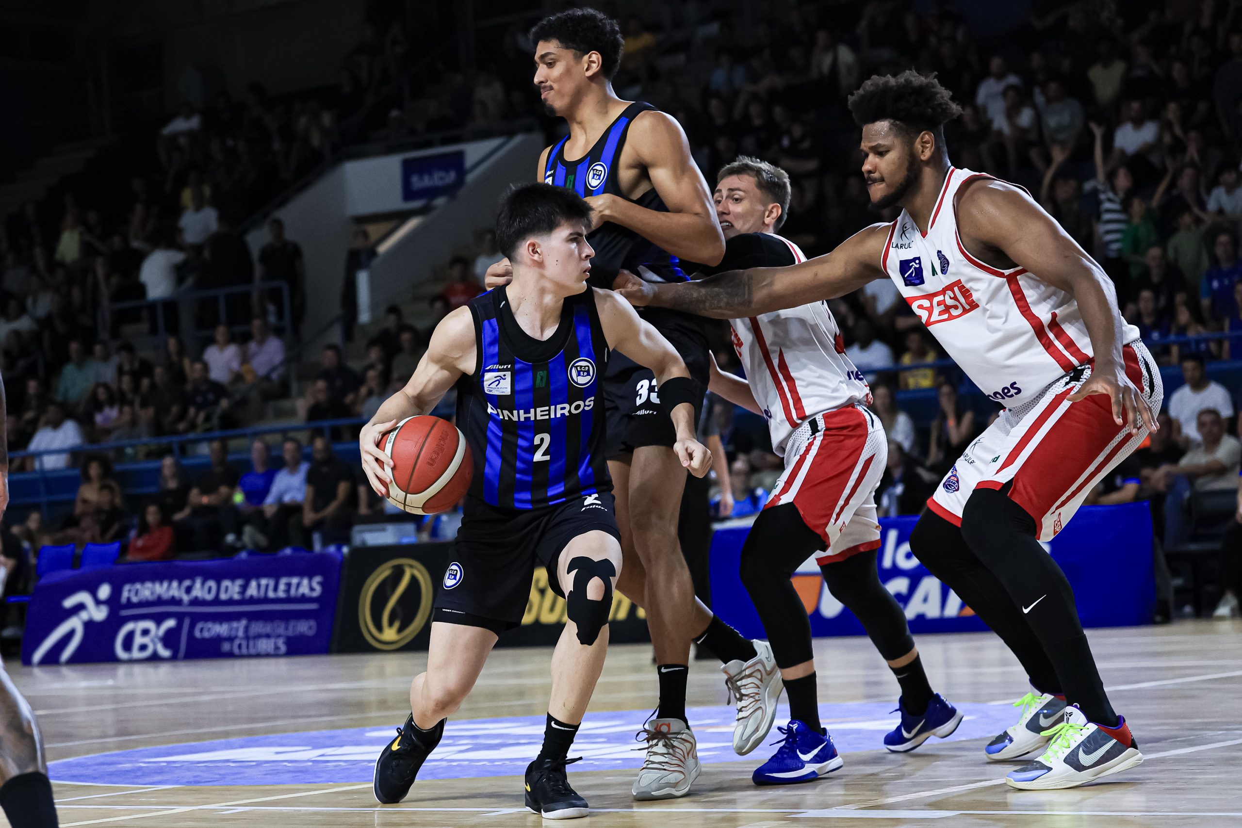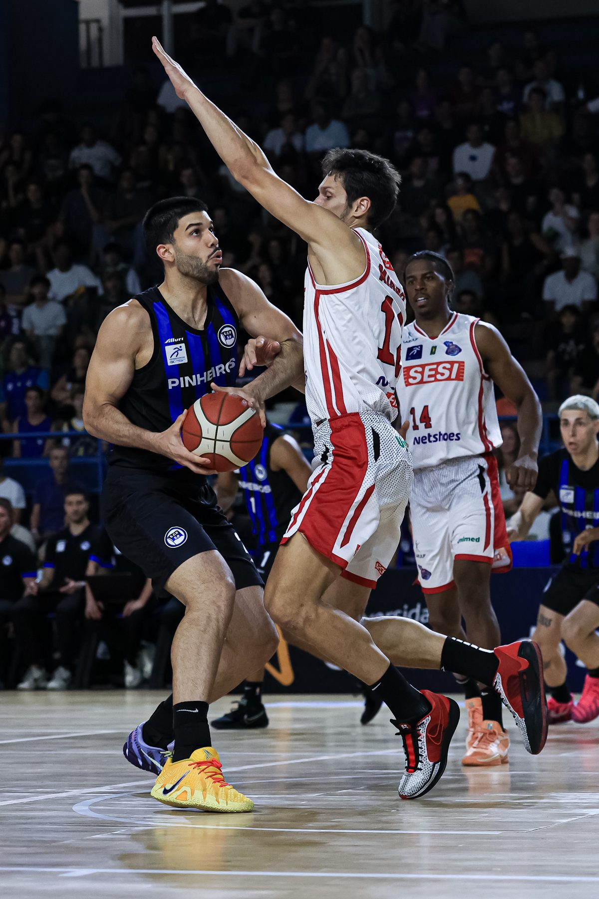 David Sloan voltou elétrico para o segundo período, acelerando o ritmo e comandando uma corrida de 7 a 0 que colocou o Pinheiros no controle. Os ataques encontraram melhores ângulos para trabalhar, especialmente no cinco contra cinco. O Sesi Franca respondeu com altíssimo aproveitamento do perímetro, com 71,4%, com cinco bolas convertidas em sete tentativas, punindo qualquer espaço concedido. Ainda assim, o time azul e preto foi mais consistente, atacou melhor as trocas defensivas e venceu o quarto por 30 a 27, indo para o intervalo com vantagem: 46 a 44.