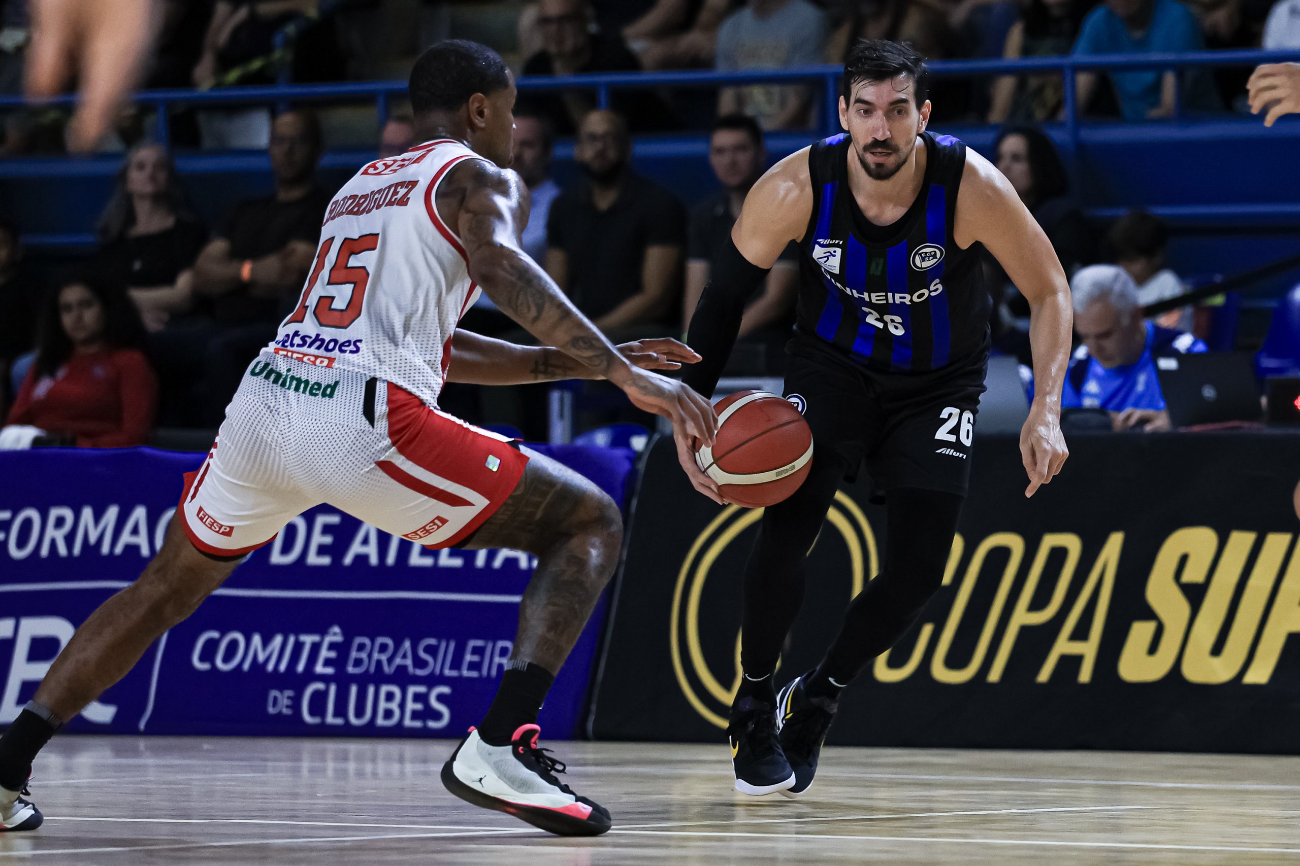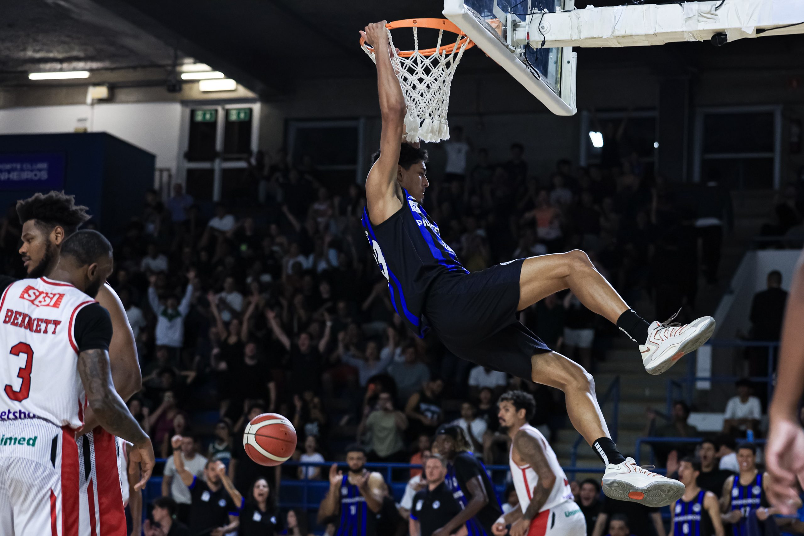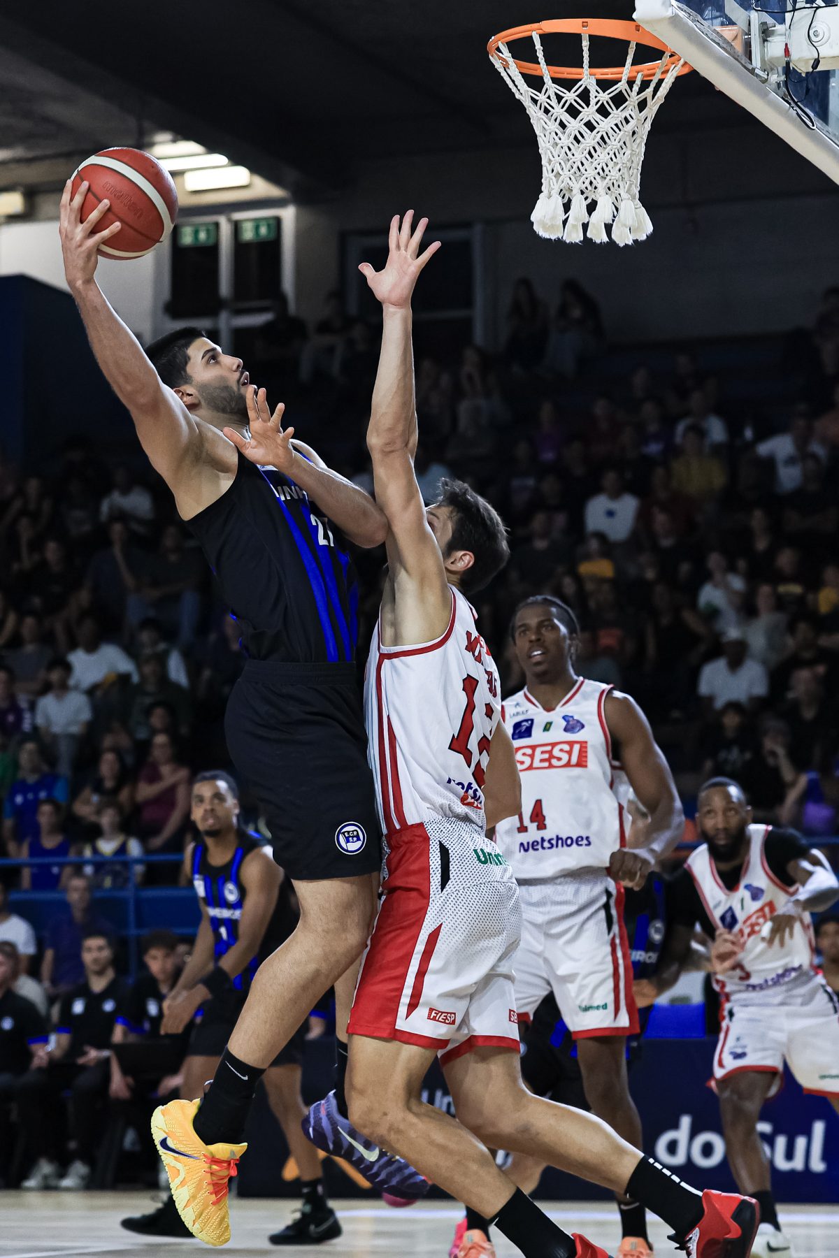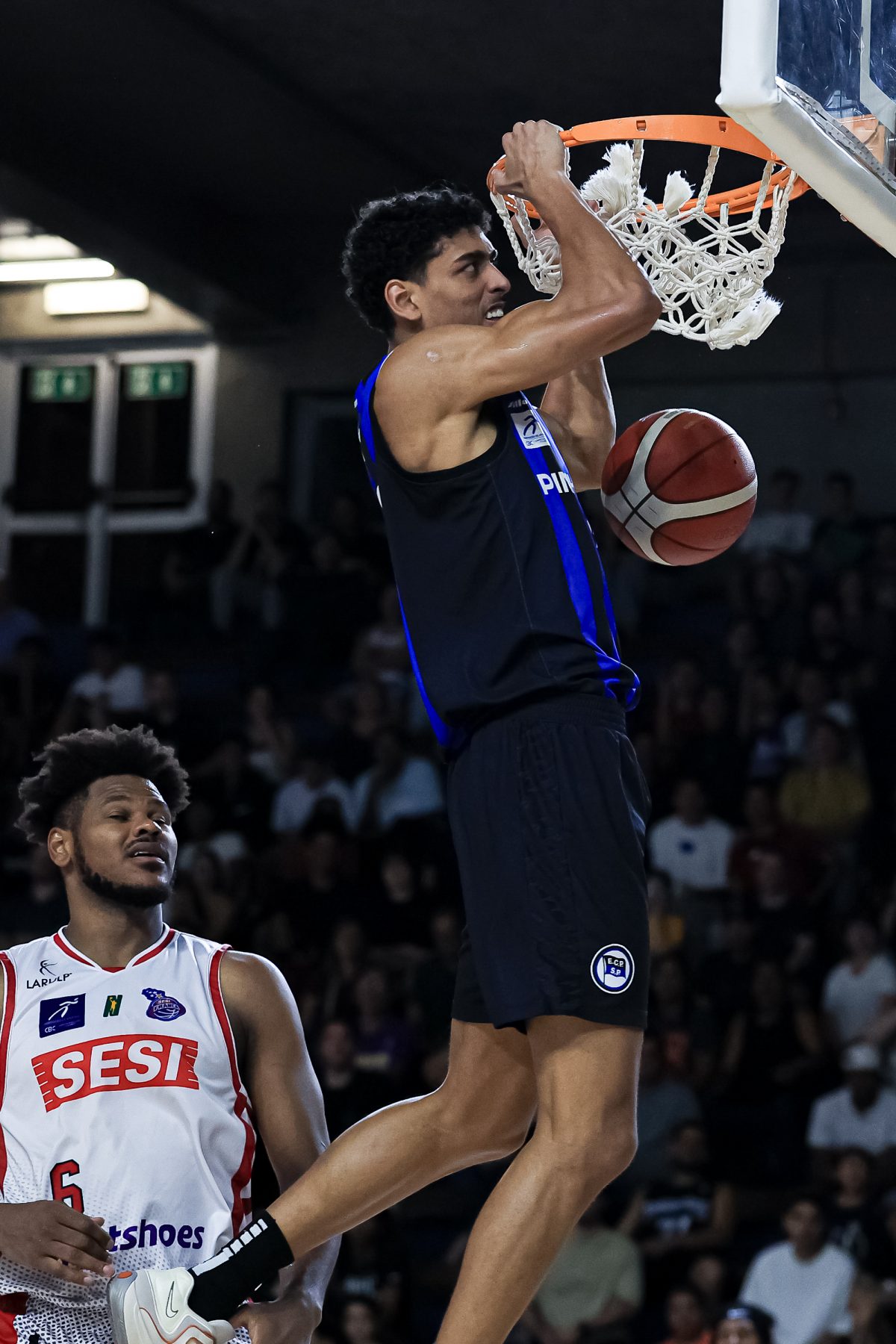 David Sloan voltou elétrico para o segundo período, acelerando o ritmo e comandando uma corrida de 7 a 0 que colocou o Pinheiros no controle. Os ataques encontraram melhores ângulos para trabalhar, especialmente no cinco contra cinco. O Sesi Franca respondeu com altíssimo aproveitamento do perímetro, com 71,4%, com cinco bolas convertidas em sete tentativas, punindo qualquer espaço concedido. Ainda assim, o time azul e preto foi mais consistente, atacou melhor as trocas defensivas e venceu o quarto por 30 a 27, indo para o intervalo com vantagem: 46 a 44.