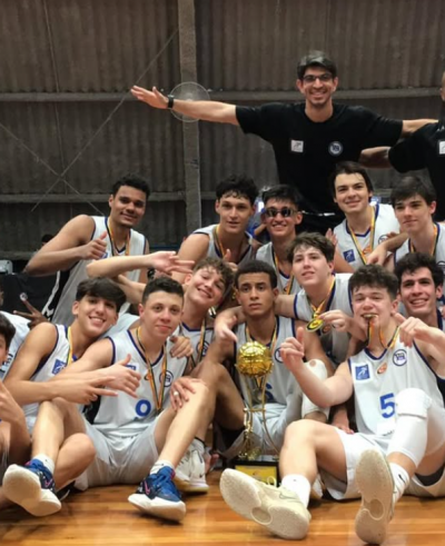 Jojo Moreira (ao centro, com o troféu) comemorando o título do CBI sub-16 de 2022. Foto: Arquivo Pessoal