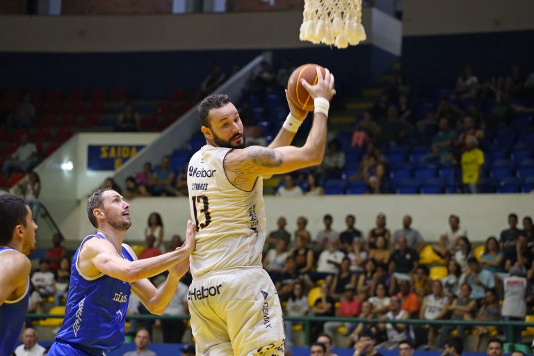 Lelê pega rebote ofensivo.