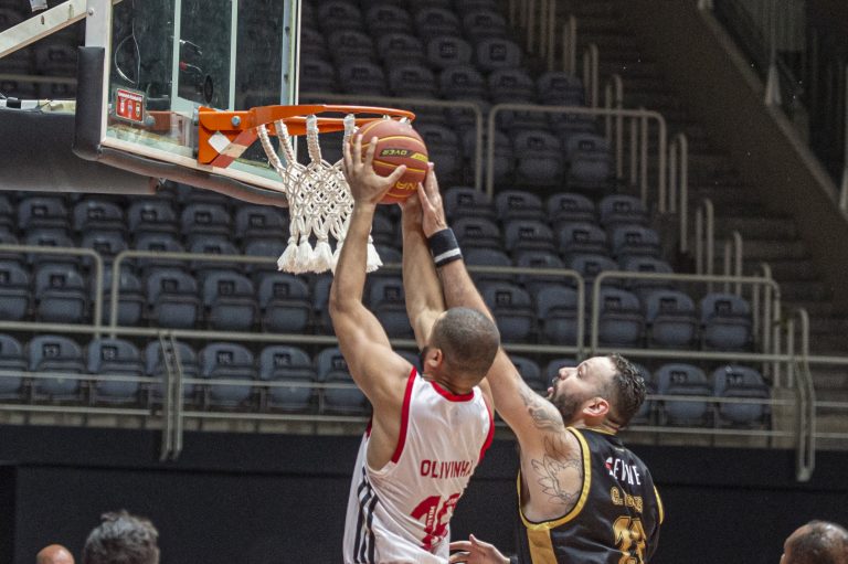 Olivinha pega rebote ofensivo.