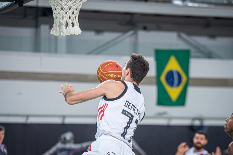 É de três! Léo Demétrio acerta arremesso de três pontos.