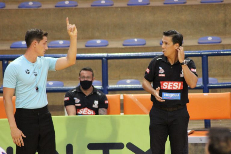 Técnico da equipe Fortaleza Basquete Cearense pede tempo.