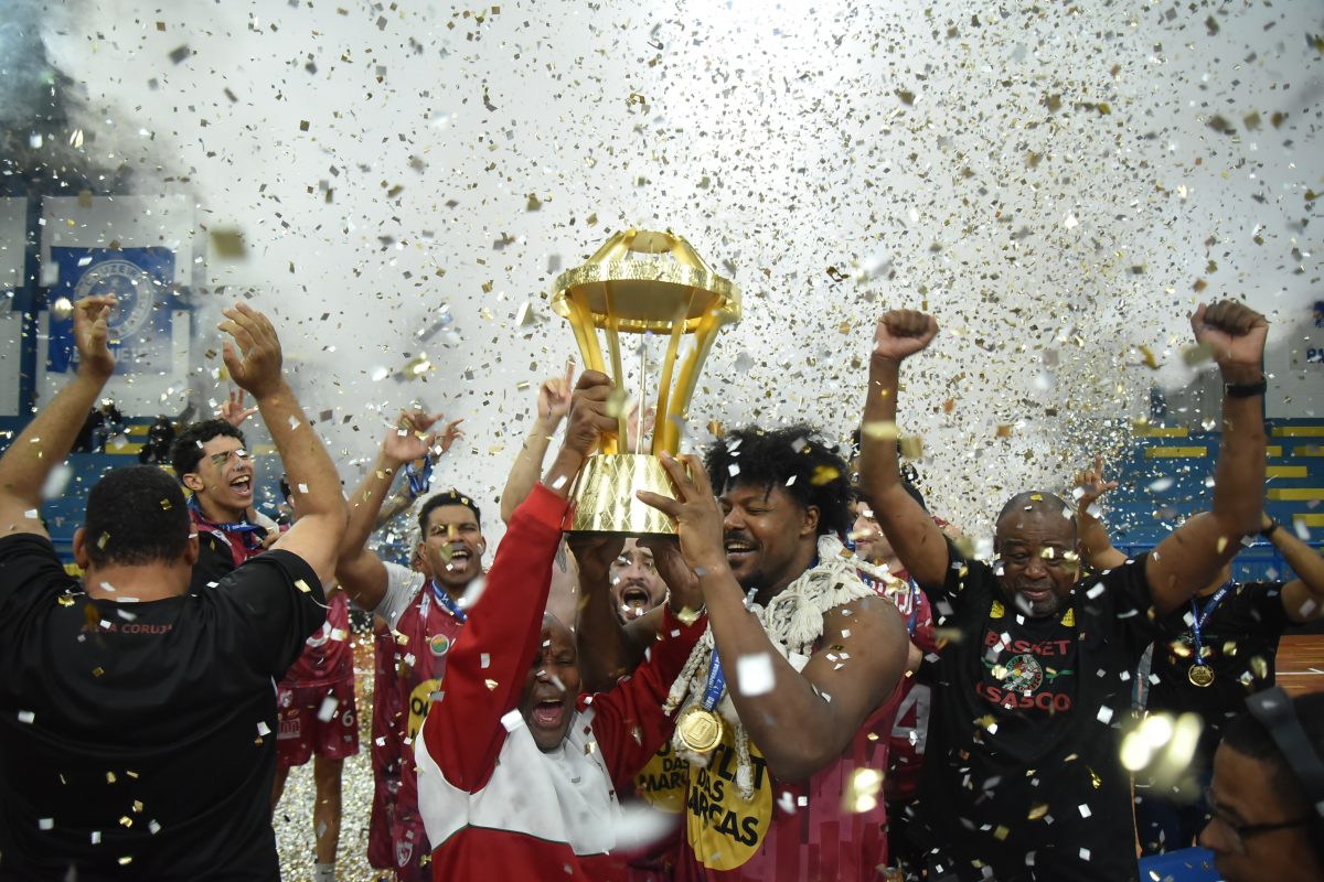 Zé foi chamado pelo capitão Hátila Passos para levantar junto a taça da Liga Ouro. Foto: Bruno Ulivieri/Basket Osasco