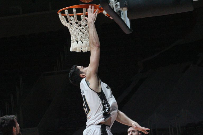 Rafa pega rebote ofensivo.