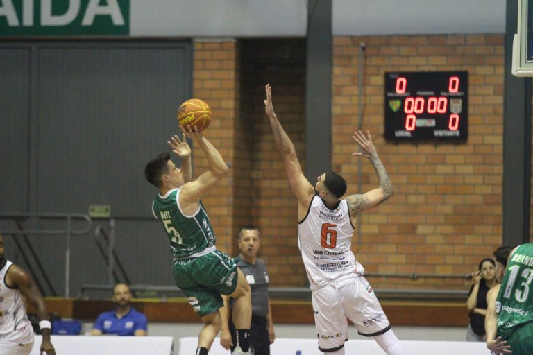 É de três! Vini Chagas acerta arremesso de três pontos.