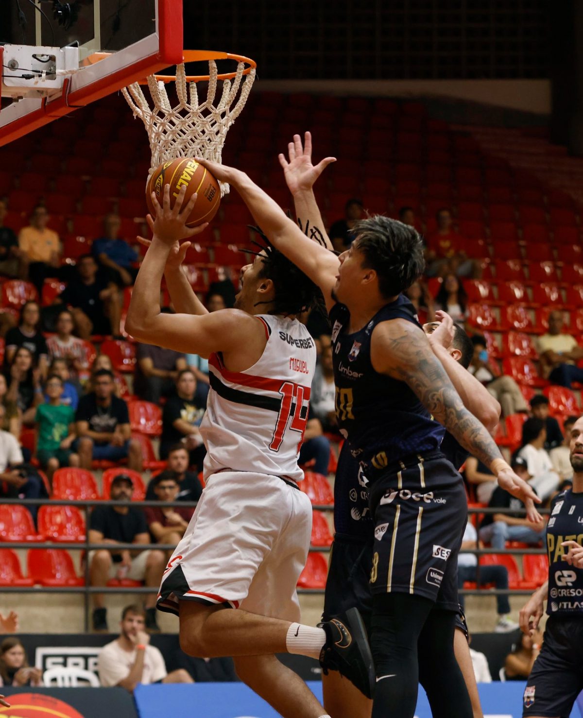 Paulo pega rebote ofensivo.