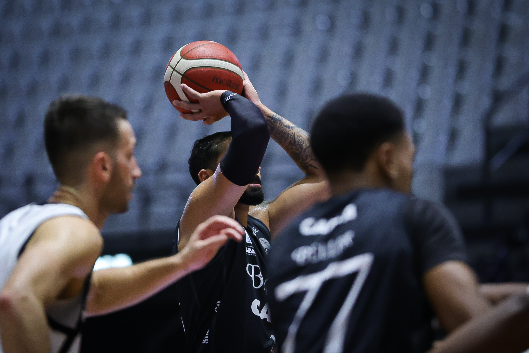 É de três! Brunão acerta arremesso de três pontos.