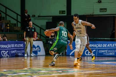 Andrezão, com o 10 na temporada pelo Cerrado Basquete, na marcação de Alex, o responsável por ele trocar para o 23 no Bauru Basket. Foto: Mateus Tourinho