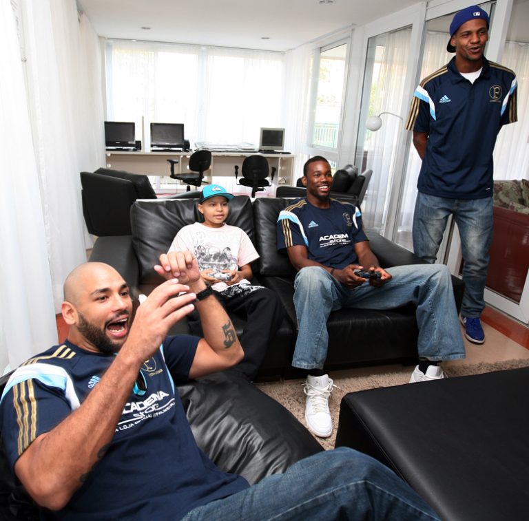 Em outro ambiente da Casa, a diversão era outra. O jovem Claudiano Pantalão desafiou o pivô Átila dos Santos em uma partida de futebol no vide-game. A habilidade do garoto que mora no instituto não foi párea para o jogador do Palmeiras, que depois foi acompanhado pelos alas Diego e Fabrício.