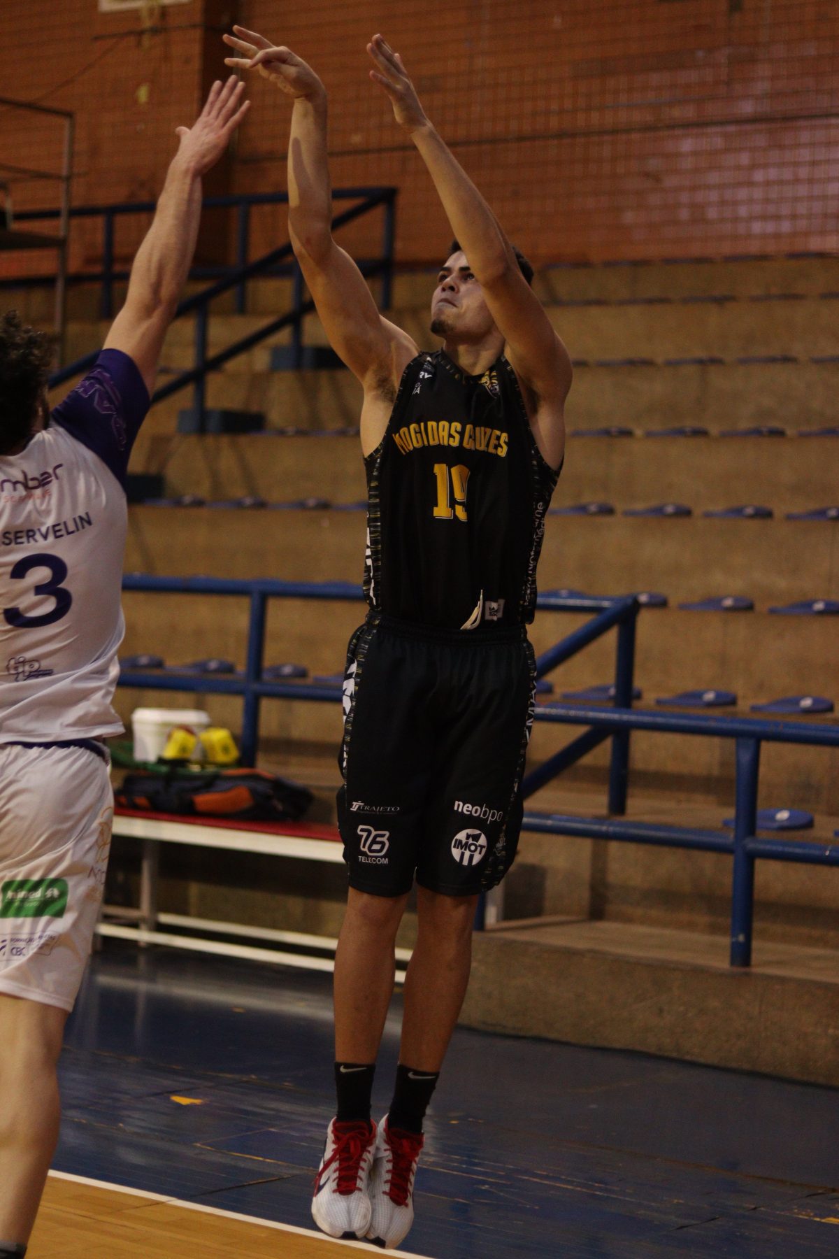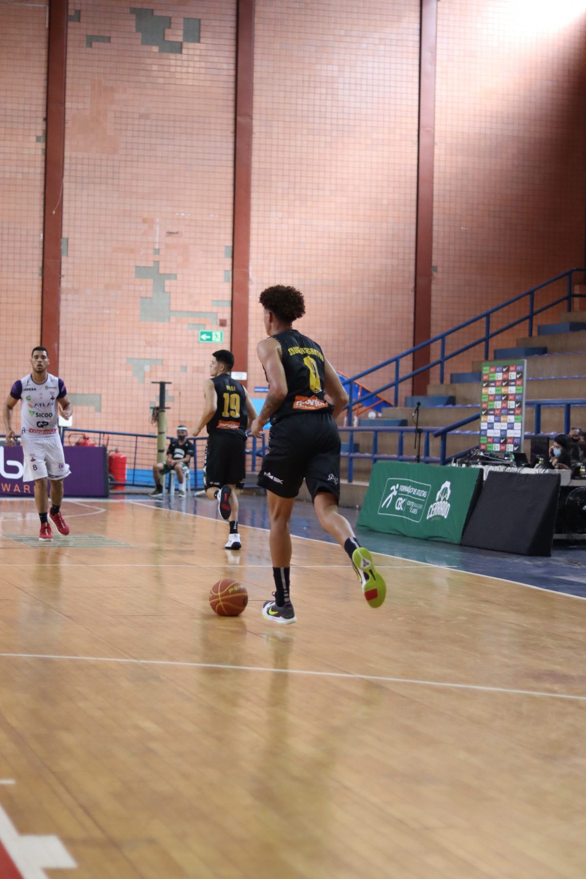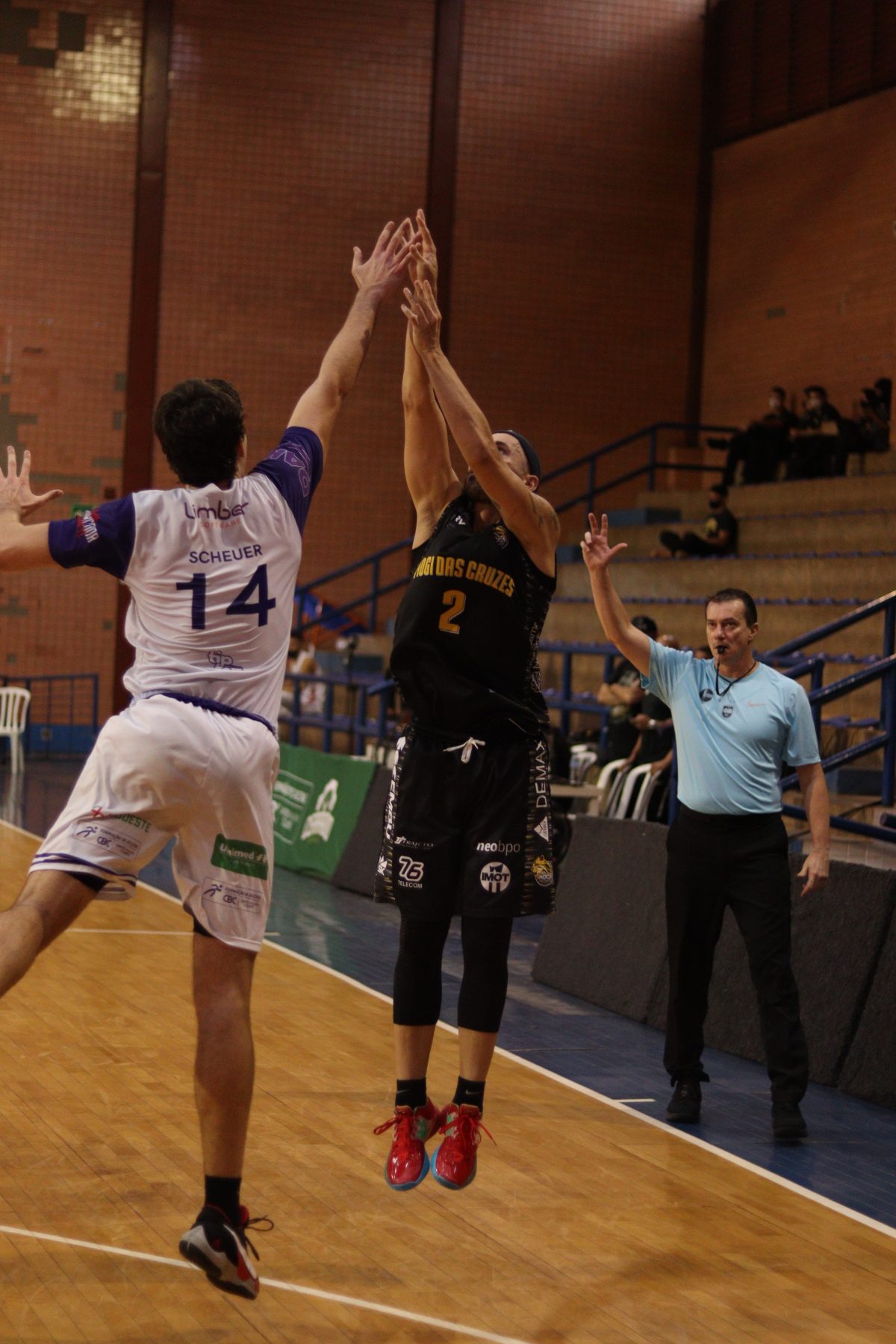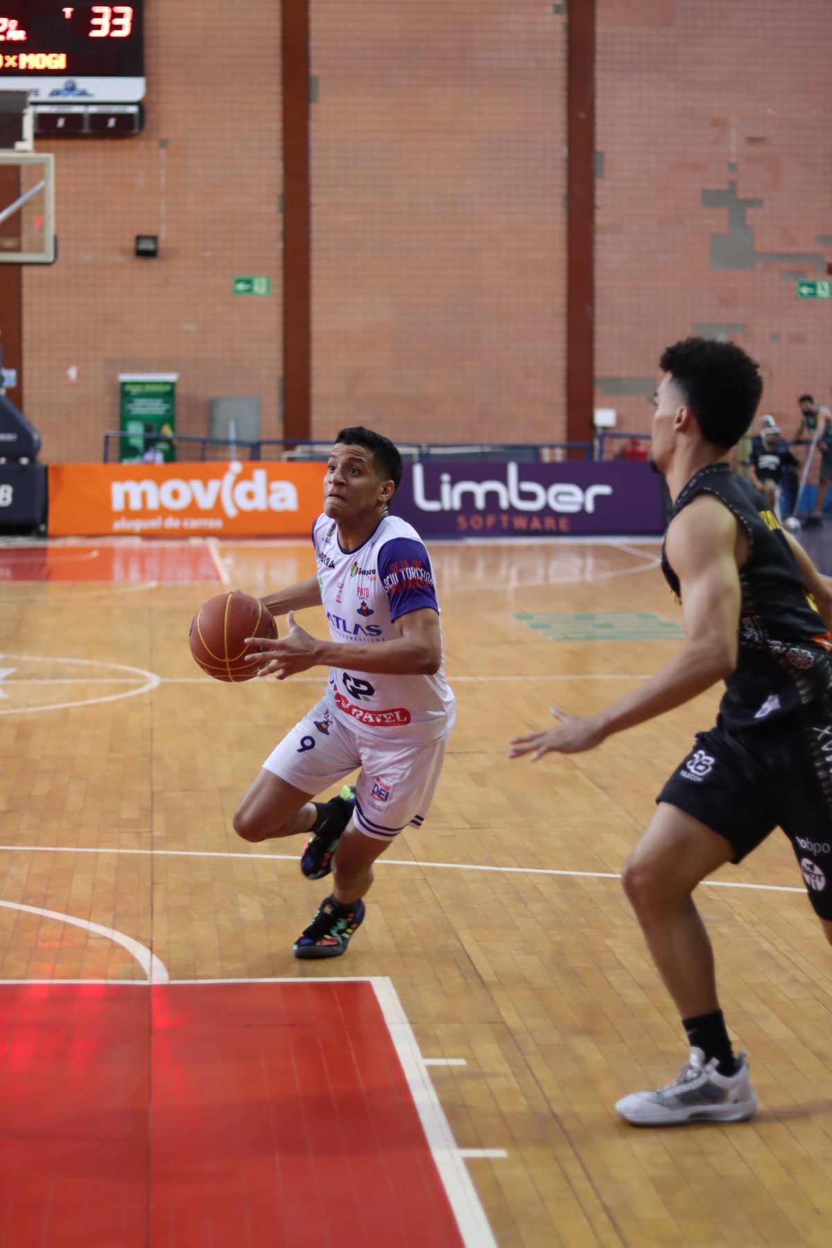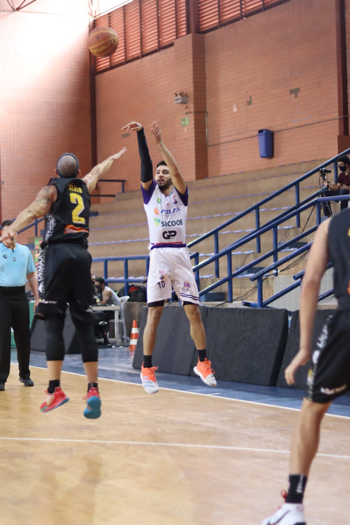 É de três! Douglas Santos acerta arremesso de três pontos.