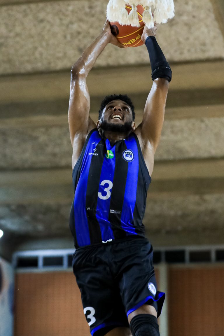 Cauê pega rebote ofensivo.