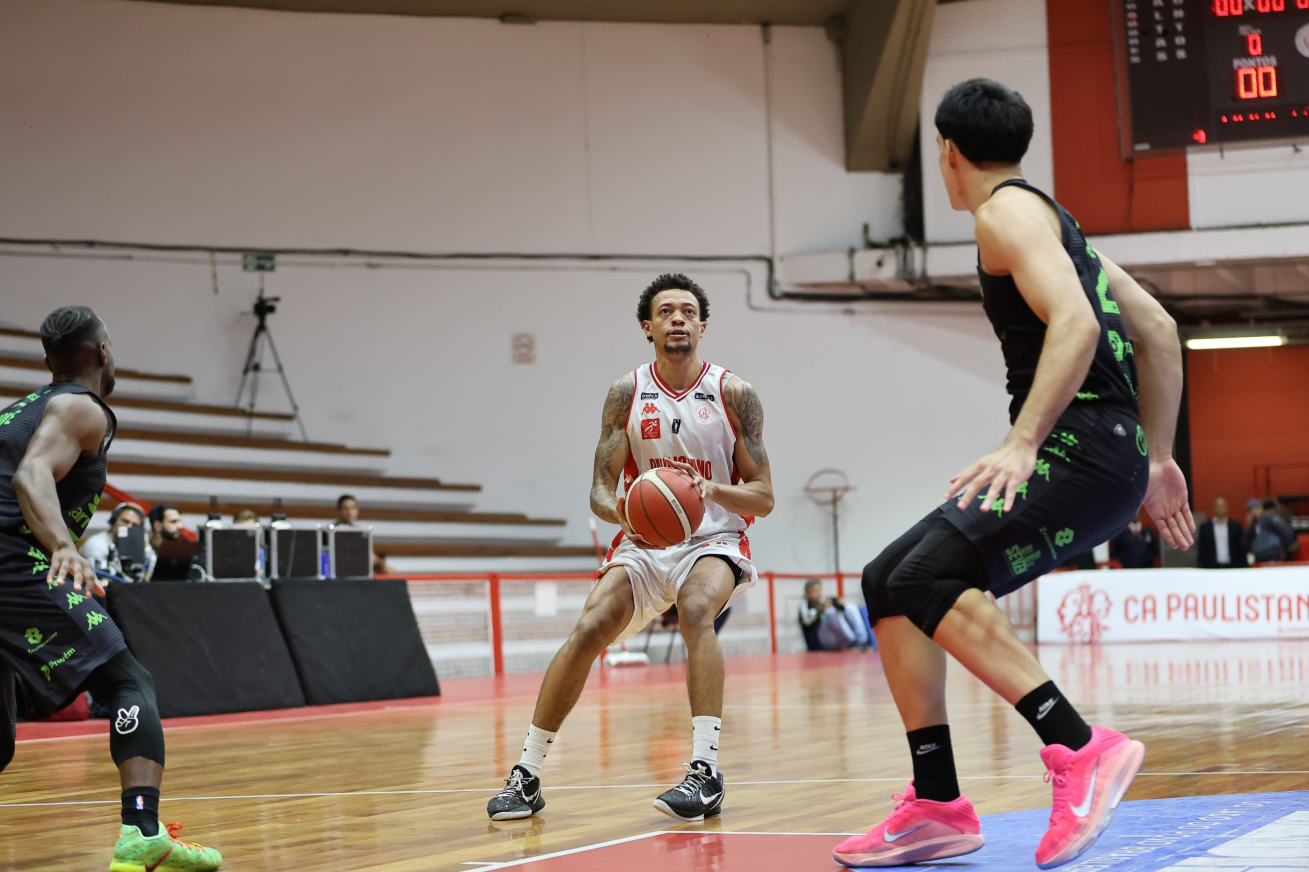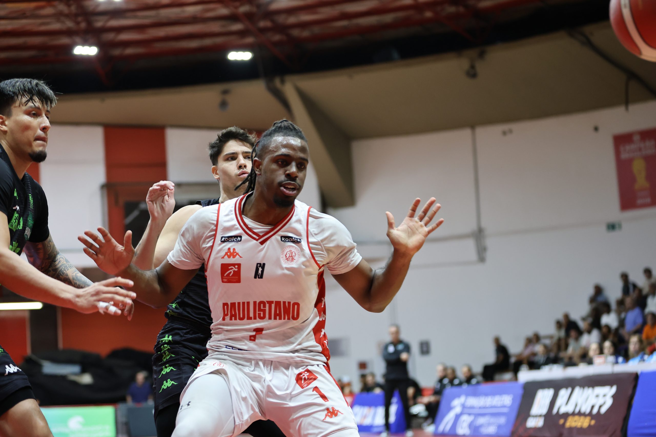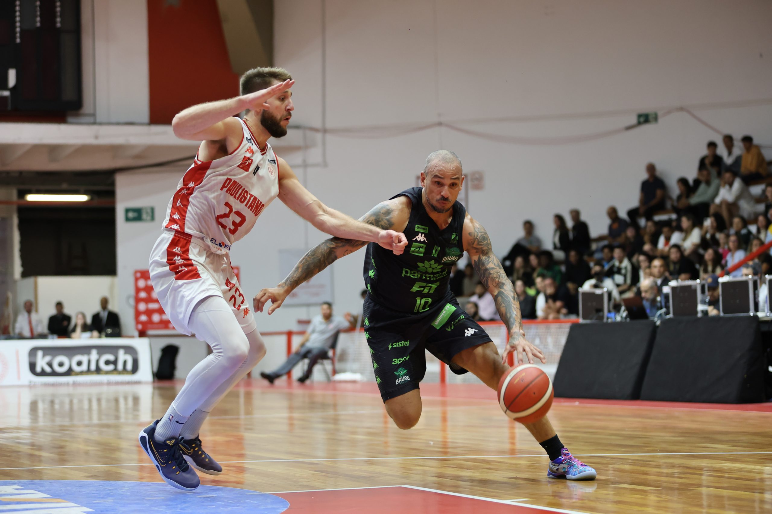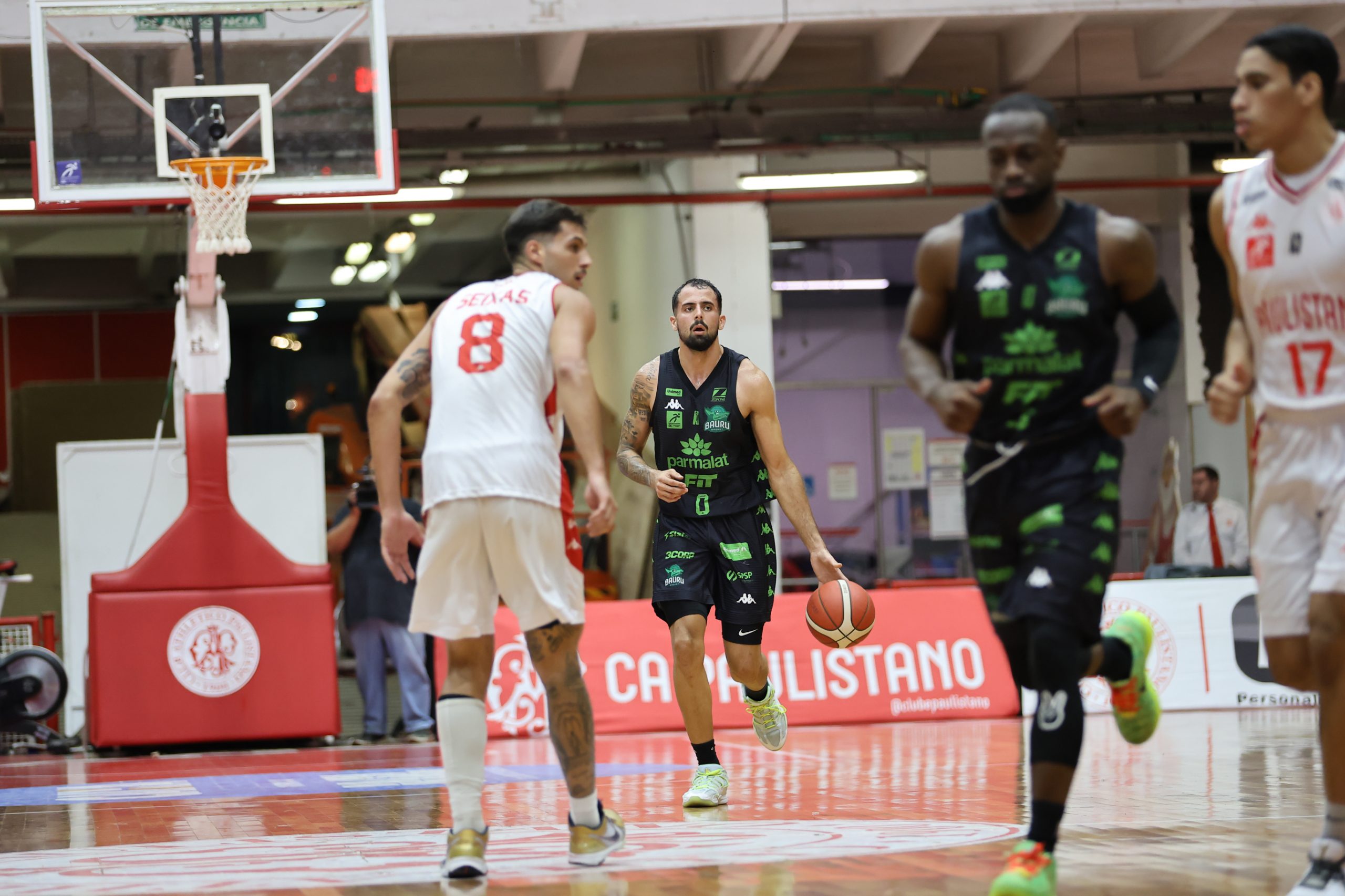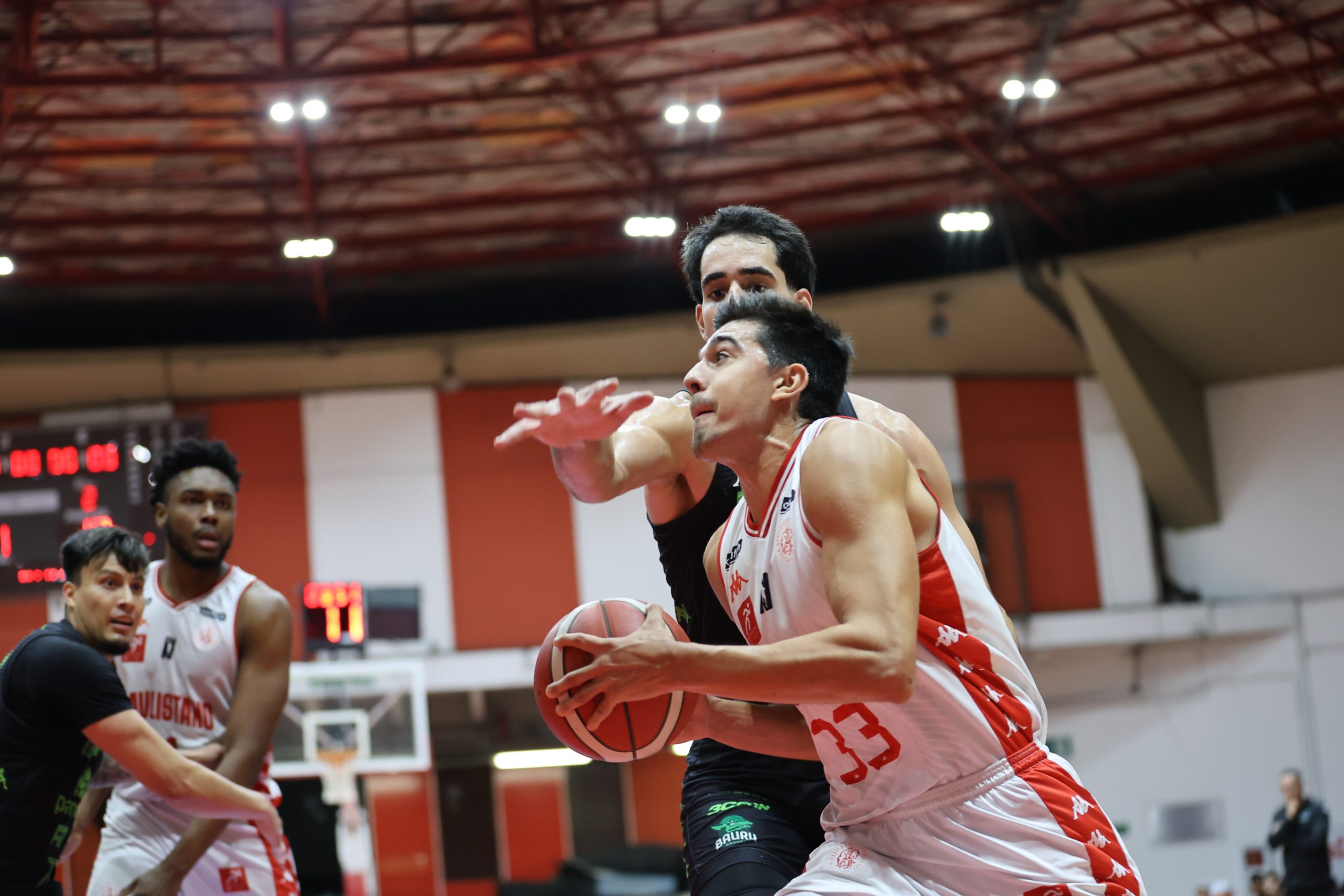A defesa foi o principal fator de controle do Paulistano no primeiro período, não apenas pela agressividade na bola, mas sobretudo pela capacidade de adaptação ao longo das posses. A equipe mostrou uma estrutura defensiva altamente mutável, ajustando comportamentos, o que evidencia um plano de jogo muito bem preparado para a abertura da série. Essa variação constante gerou hesitações no ataque do Bauru Basket, que teve dificuldade para encontrar fluidez e tomar decisões com conforto, resultando em baixo aproveitamento e leitura comprometida. O time alvirrubro construiu uma vantagem consistente de 21 a 13 ao fim da parcial inicial.