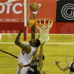 Thiaguinho erra tentativa para três pontos.