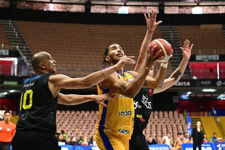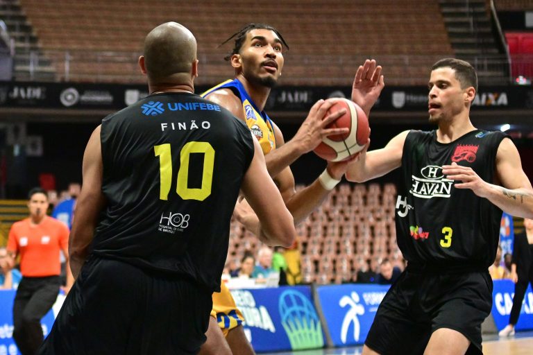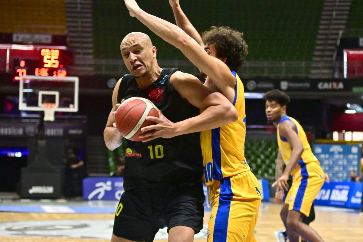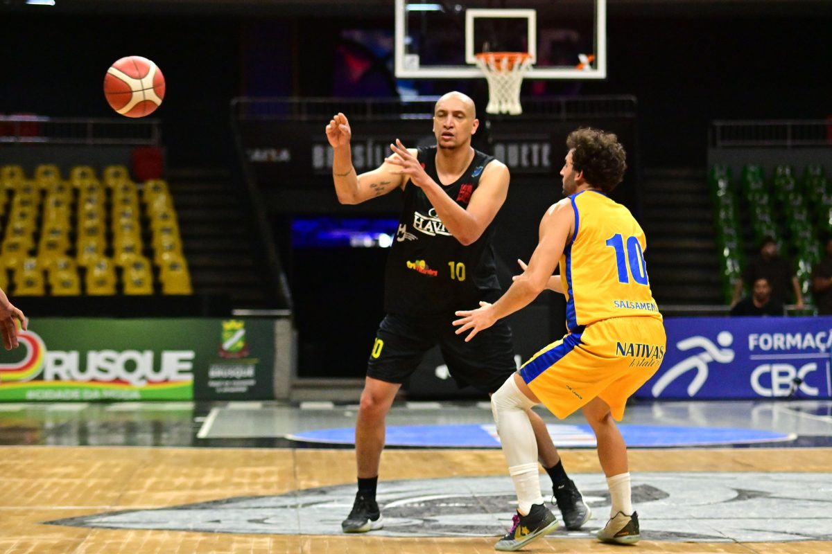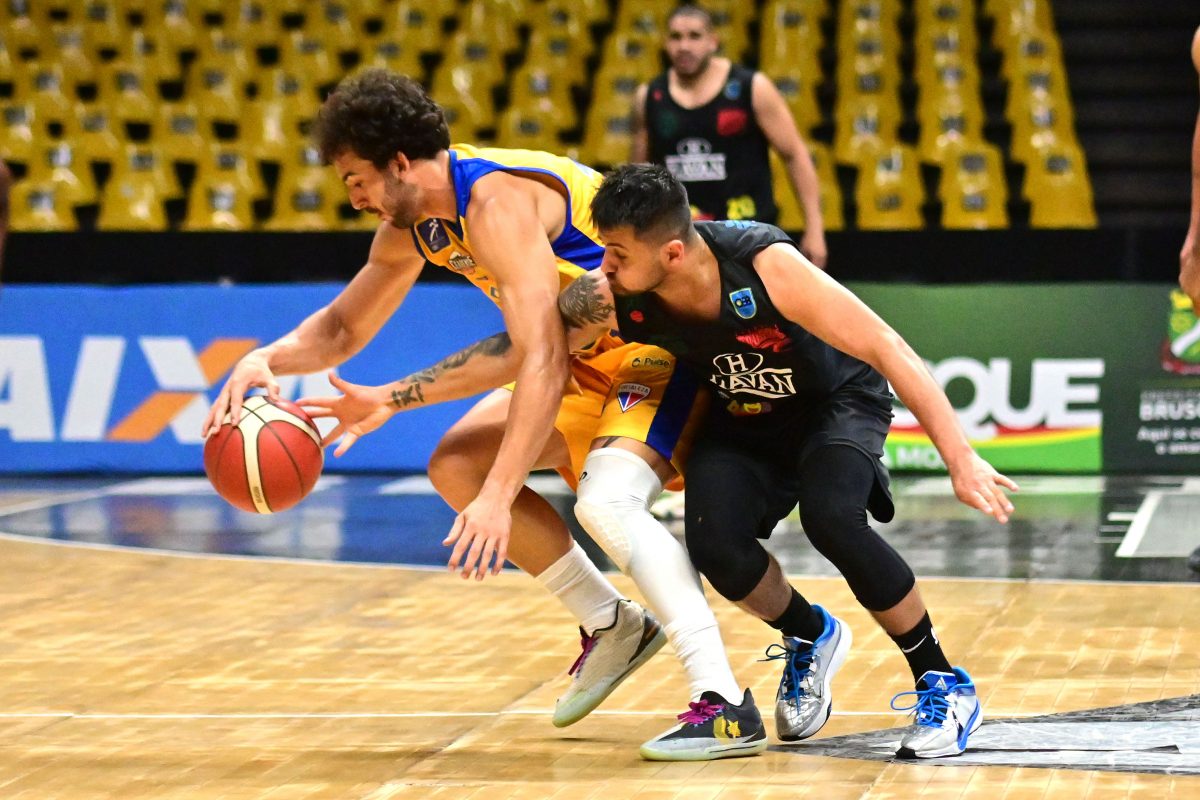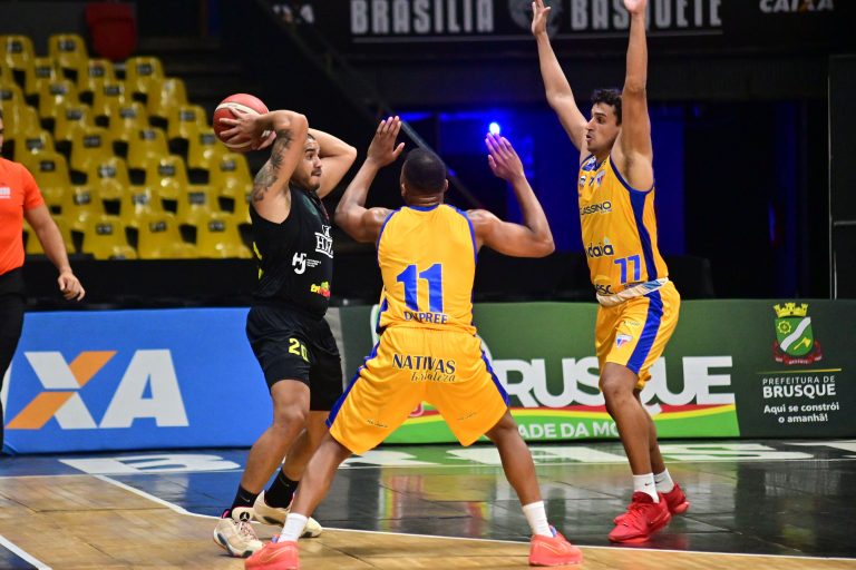 Brusque Basquete pega rebote ofensivo.
